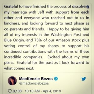 I am so proud of Jeff and Mackenzie Bezos. This is why they are successful and will continue to be. Kudos to you richest people in the world, for showing us what a GOOD divorce looks like.
